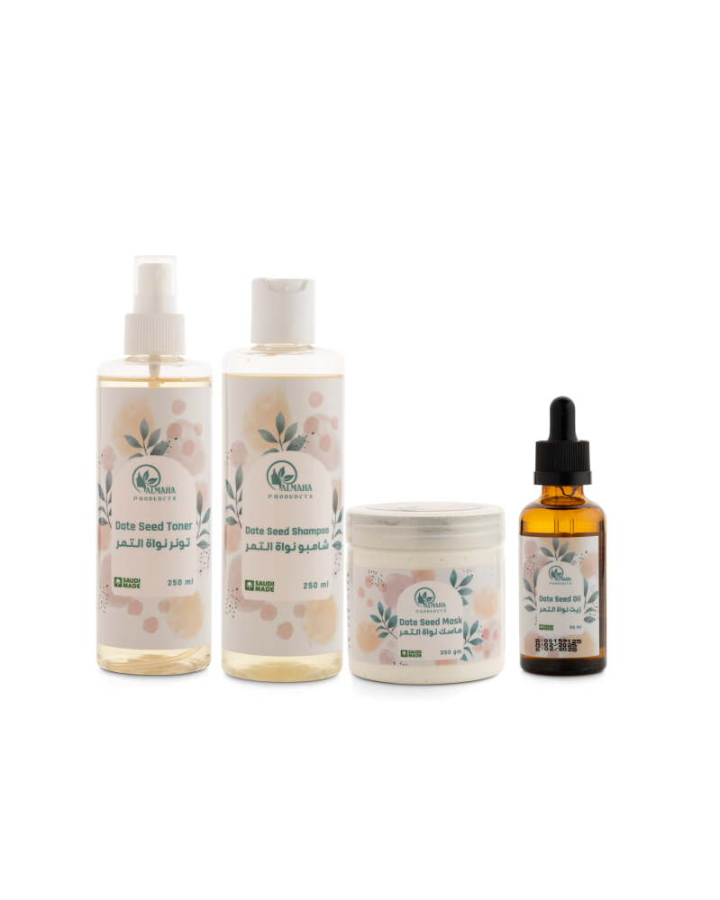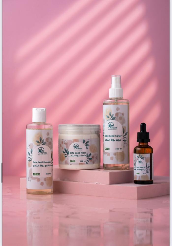 رحلة متكاملة لشعر أقوى، أطول، وأكثر كثافة… بمكونات طبيعية مستخلصة من سحر نواة التمر!